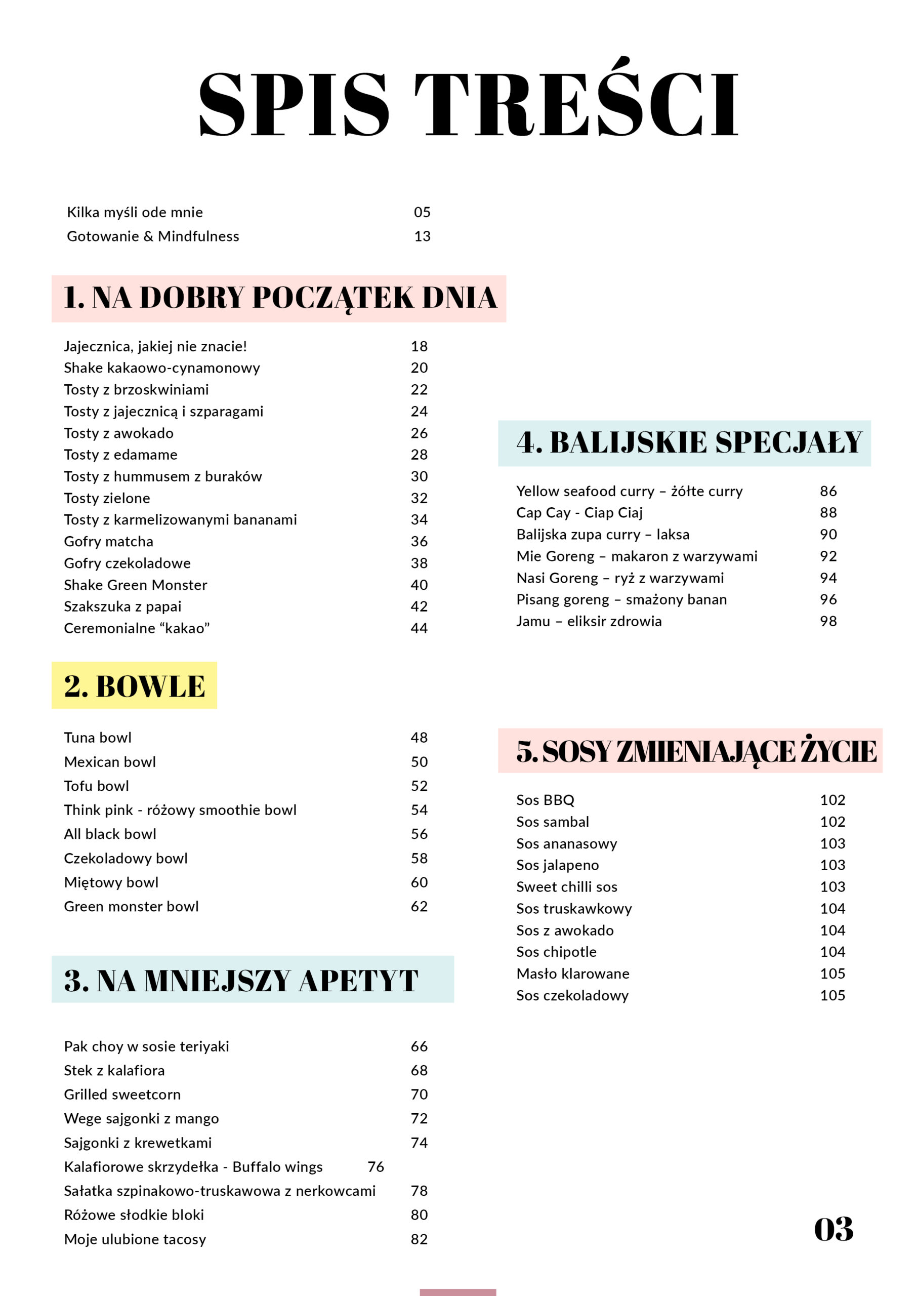 Mieszkając ostatnie pół roku na Bali zagłębiłam się bardzo w tamtejszą kulturę, ludzi, styl życia, ale przede wszystkim najbardziej pokochałam kuchnię. Stworzyłam własne wersje przepisów, które tak bardzo polubiłam wcześniej w balijskich restauracjach czy poznałam od balijskich przyjaciół, a którymi teraz dzielę się z Wami w tym właśnie ebooku. Teraz, kiedy tak bardzo przepełniłam się tutejszą energią i miłością do jedzenia, postanowiłam, że muszę ją Wam przekazać dalej w 47 różnych przepisach.